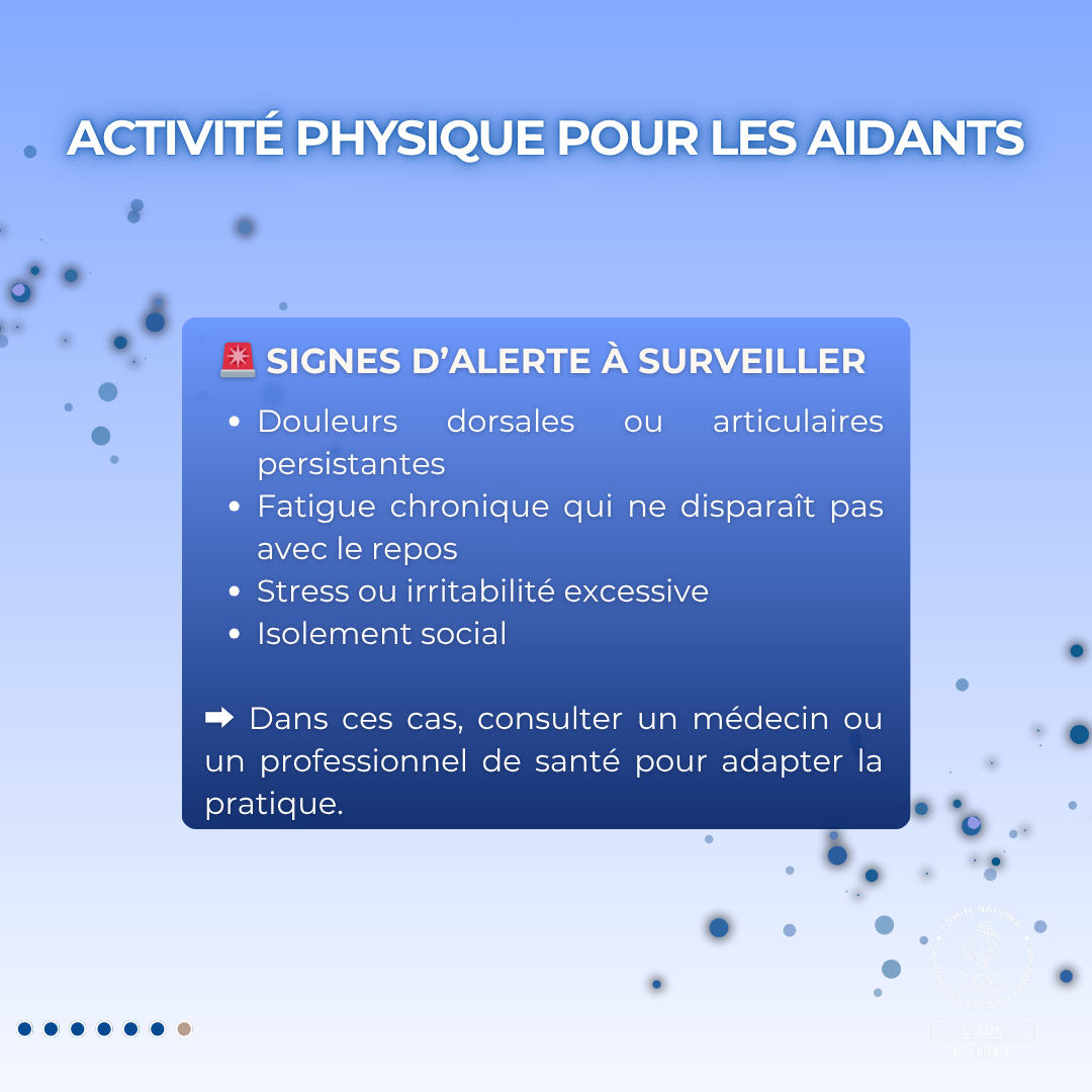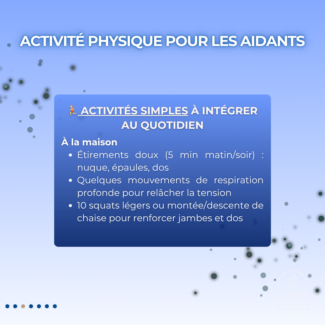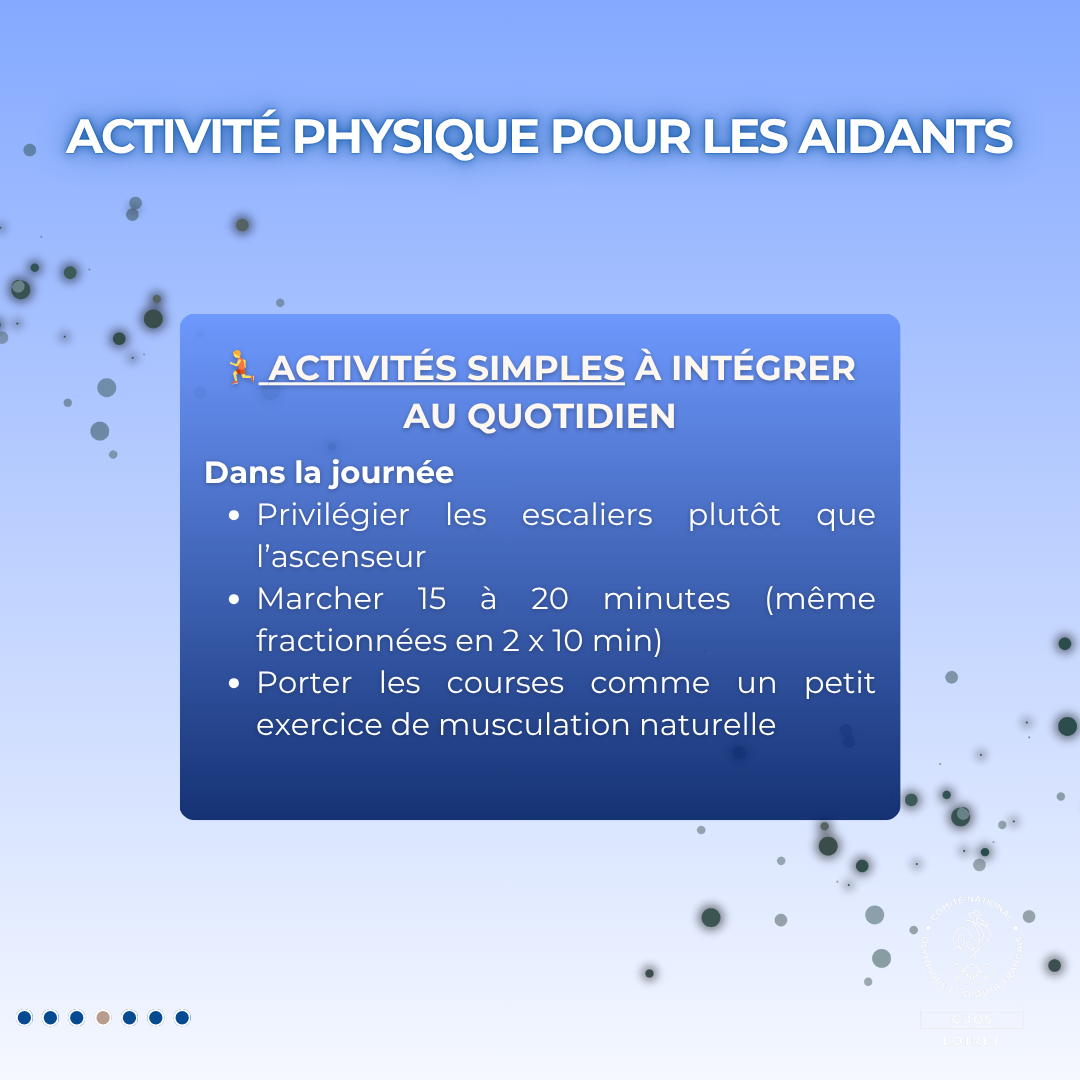 Le rôle d’aidant exige souvent des postures répétitives, du port de charges, des déplacements, etc., qui peuvent entraîner douleurs, fatigue, troubles musculo‐squelettiques. L’activité physique aide à renforcer les muscles, améliorer la posture, préserver le dos et les articulations.