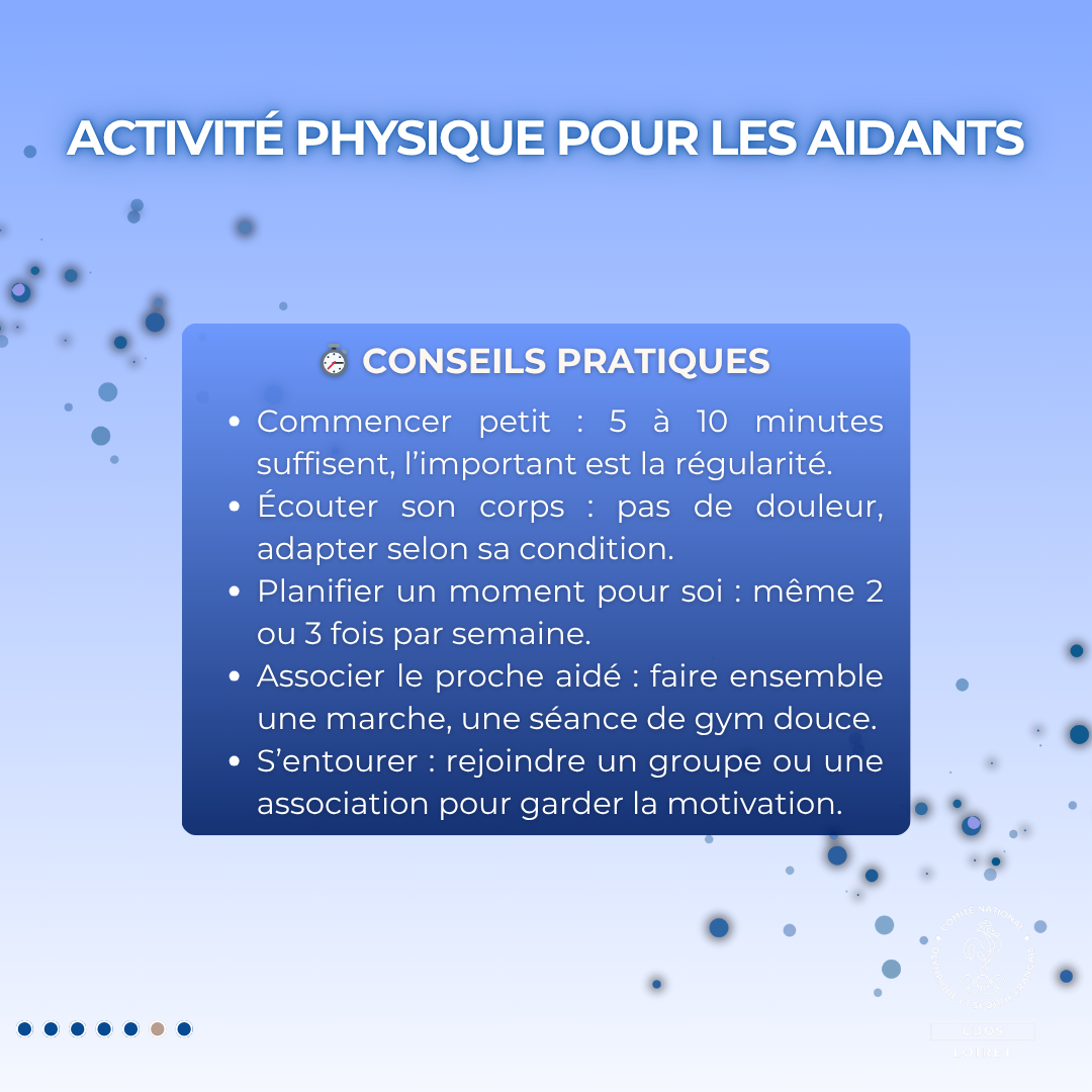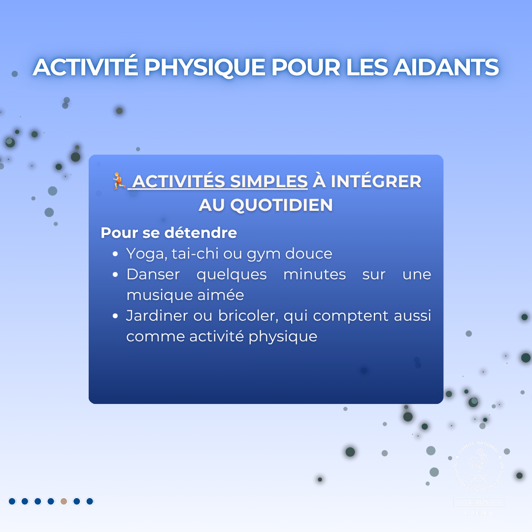 Bien bouger aide à mieux dormir, à récupérer, à avoir de la disponibilité physique et mentale pour le proche aidé. Si l’aidant est épuisé, la qualité de l’aide souffre aussi.