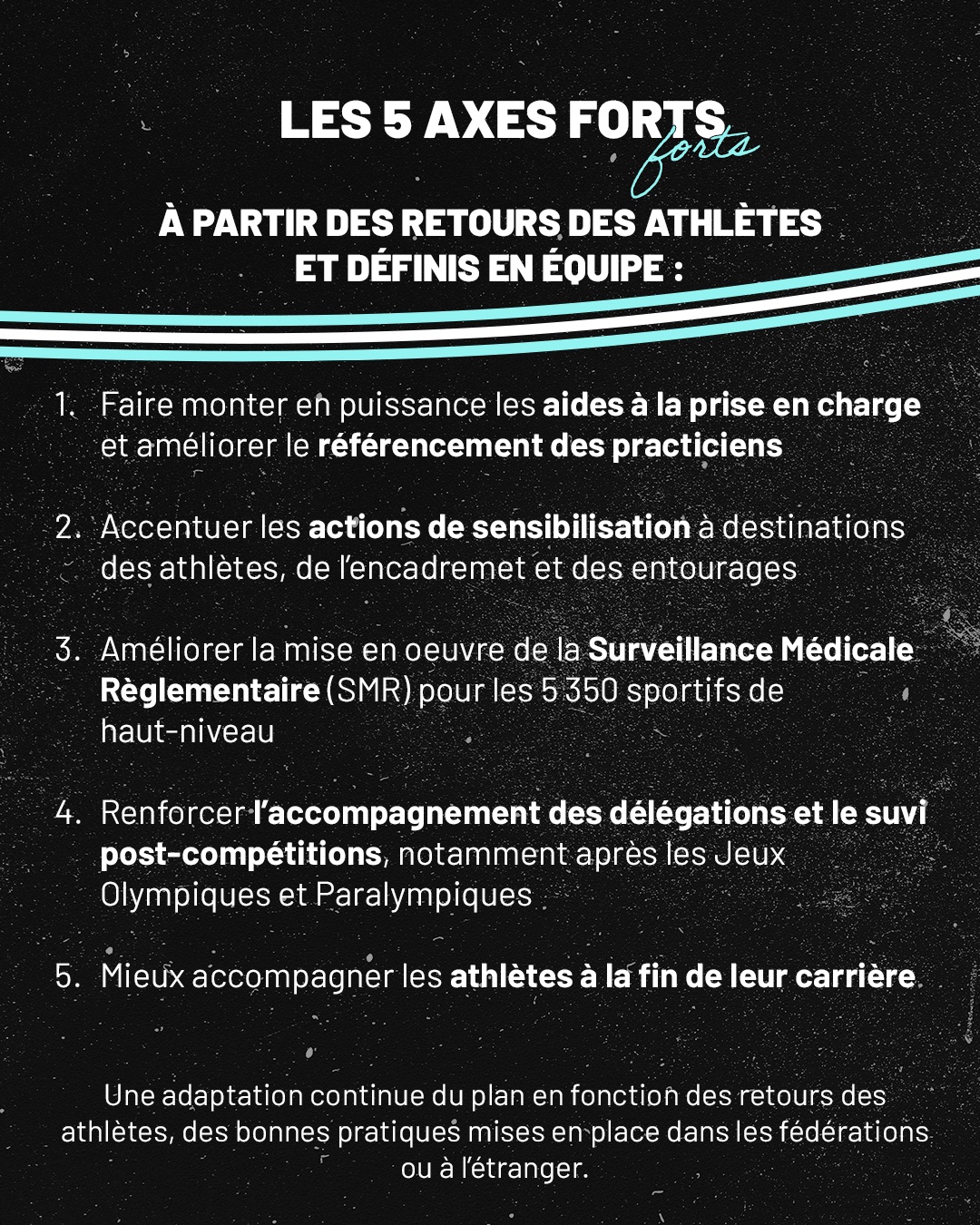 C’est pour répondre à cette alerte et à la difficulté exprimée par les sportifs qui ne savent souvent pas à qui s’adresser que le CNOSF, le CPSF, l’Agence nationale du Sport et l’INSEP, en lien avec le ministère des Sports, ont travaillé sur le plan d’actions présenté ce jour et organisé autour de 5 axes :