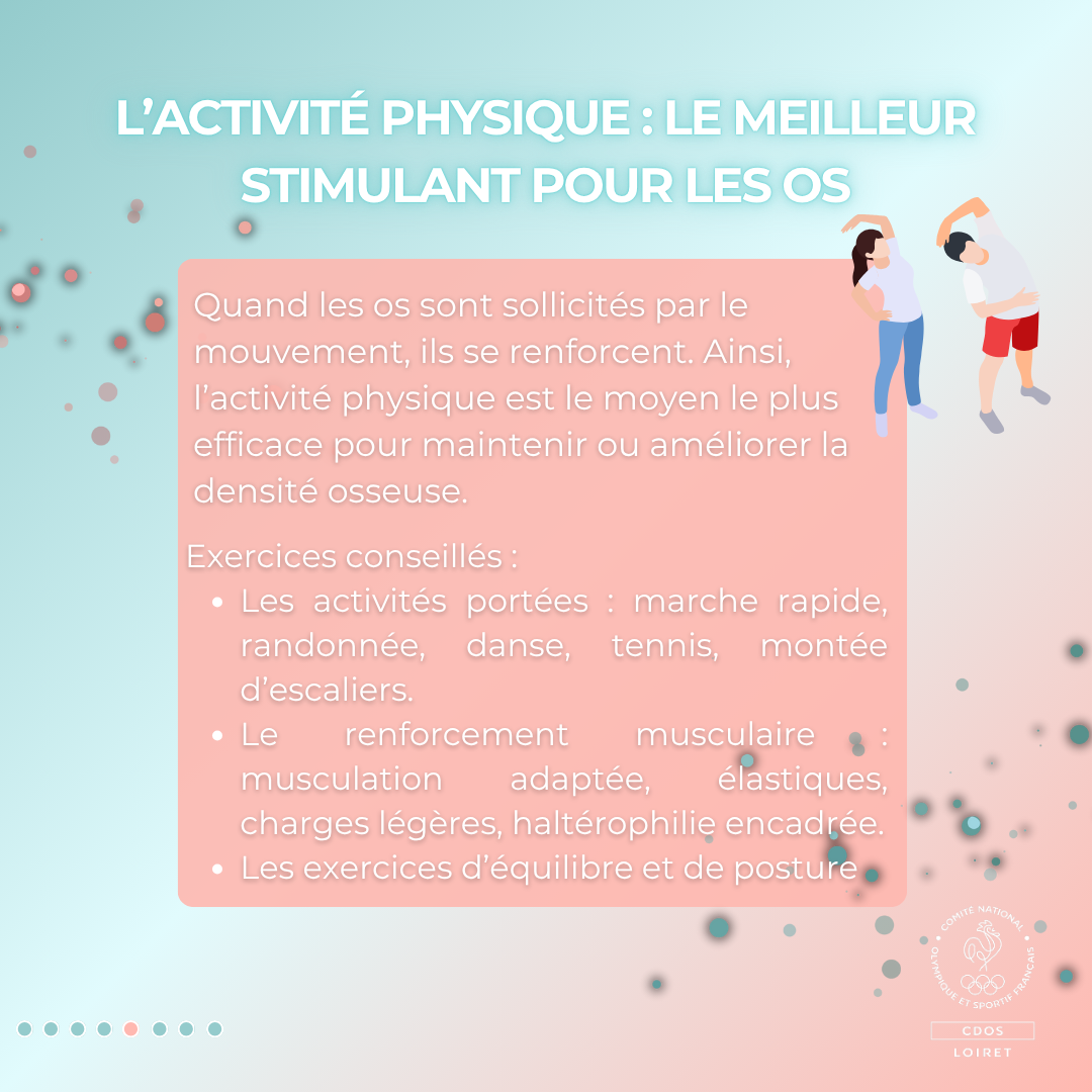 Ainsi, l’activité physique est le moyen le plus efficace pour maintenir ou améliorer la densité osseuse.