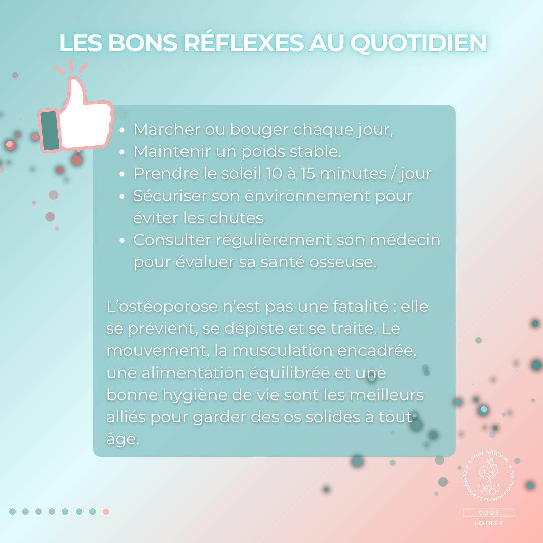 L’ostéoporose n’est pas une fatalité : elle se prévient, se dépiste et se traite. Le mouvement, la musculation encadrée, une alimentation équilibrée et une bonne hygiène de vie sont les meilleurs alliés pour garder des os solides à tout âge.