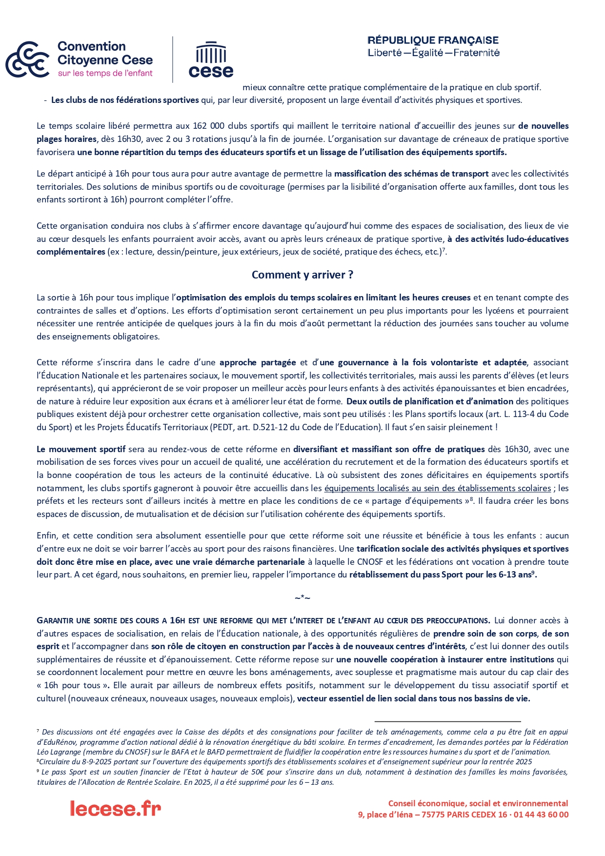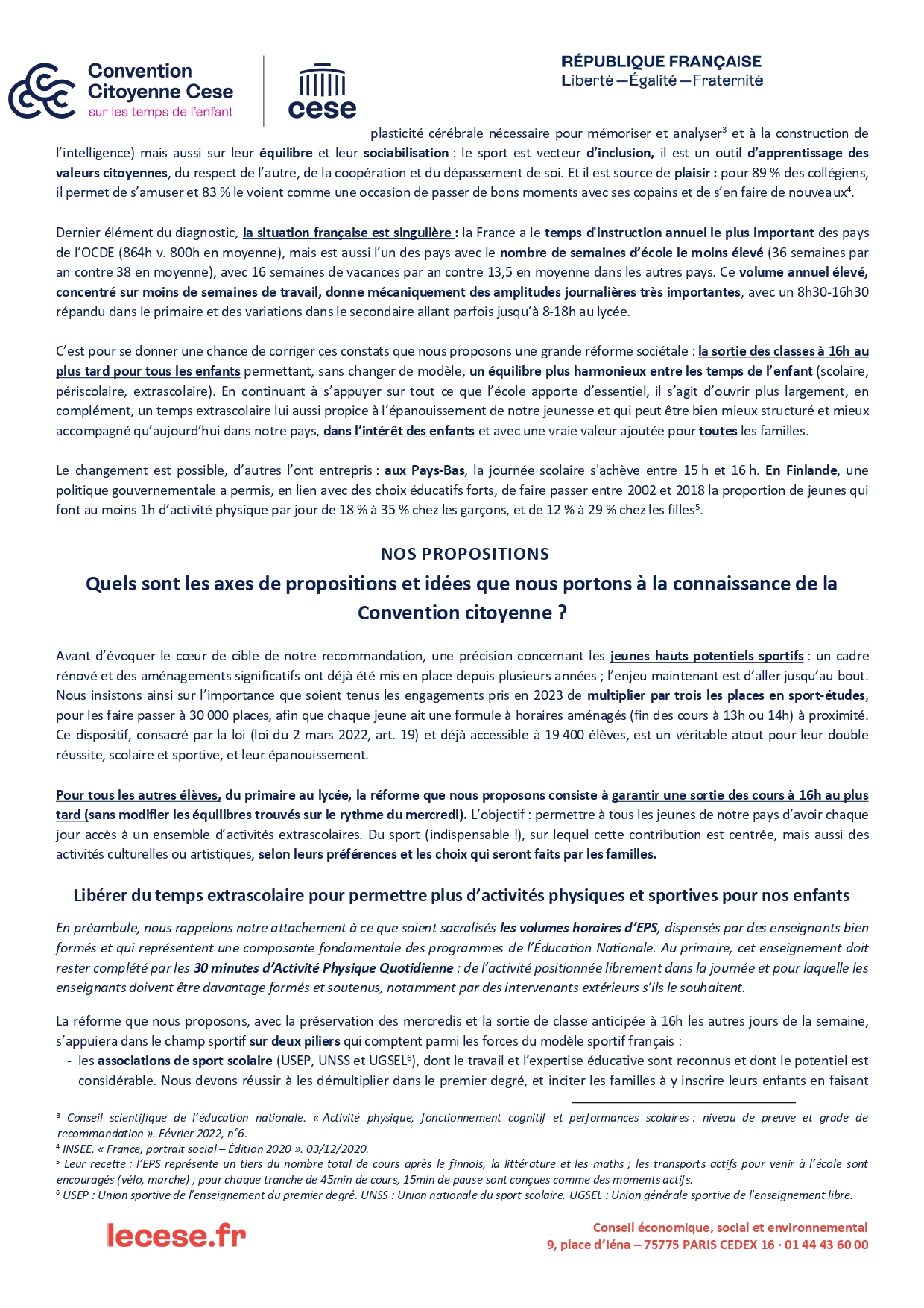 Un groupe de travail pluridisciplinaire*, piloté par la Présidente du CNOSF, a travaillé depuis le mois de juillet à l’élaboration de ce cahier d’acteur, présentant une proposition de réforme des rythmes qui découle de constats partagés entre les acteurs du sport, de l’éducation et de la recherche autour d’une mesure-phare : garantir une sortie des cours à 16h pour tous afin de libérer du temps extrascolaire pour la pratique des jeunes dans nos clubs et nos associations de sport scolaire.
