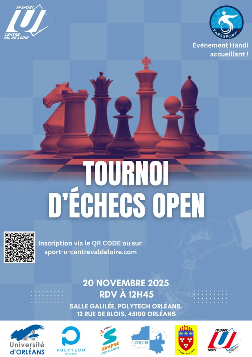 avec un tournoi d’échecs open organisé par le FSU Centre Val de Loire en collaboration avec le CDJE45 et le club d’échecs USO, cet évènement est « Handi accueillant », Il est prioritairement dédié aux étudiants mais également ouvert aux non étudiants. ..