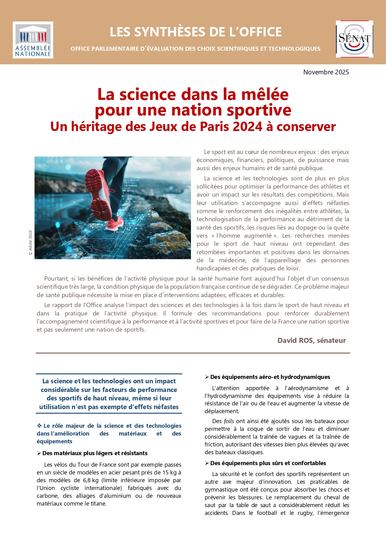 Le jeudi 13 novembre 2025, l’Office parlementaire d’évaluation des choix scientifiques et technologiques (OPECST) a examiné et adopté le rapport La science dans la mêlée pour une nation sportive (David Ros, sénateur, rapporteur).