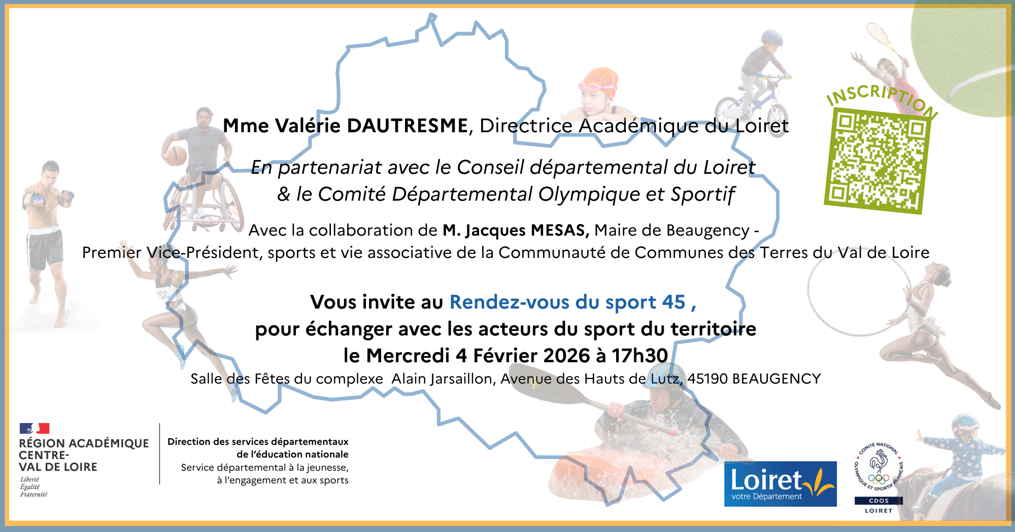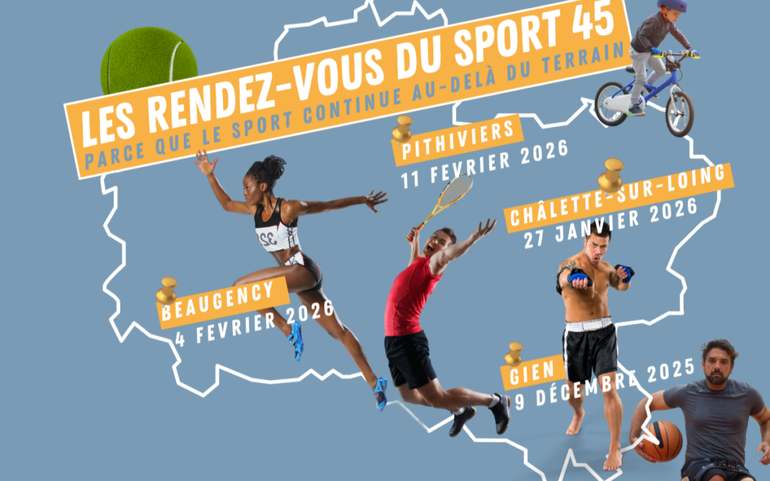 La Directrice académique et la cheffe du service départemental à la jeunesse, à l’engagement et aux sports du Loiret (SDJES 45) ont le plaisir de vous inviter aux Rendez-vous du sport 45, organisés, en partenariat avec le Conseil départemental et Comité départemental olympique et sportif du Loiret, entre décembre 2025 et février 2026 sur les secteurs du Giennois, du Montargois, du Pithiverais et des Terres du Val de Loire.