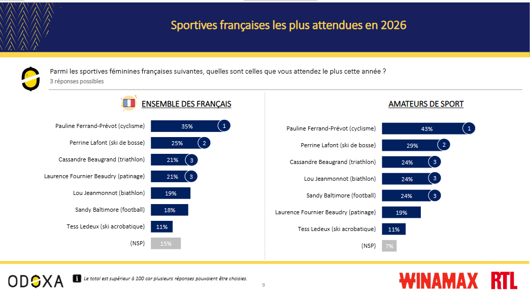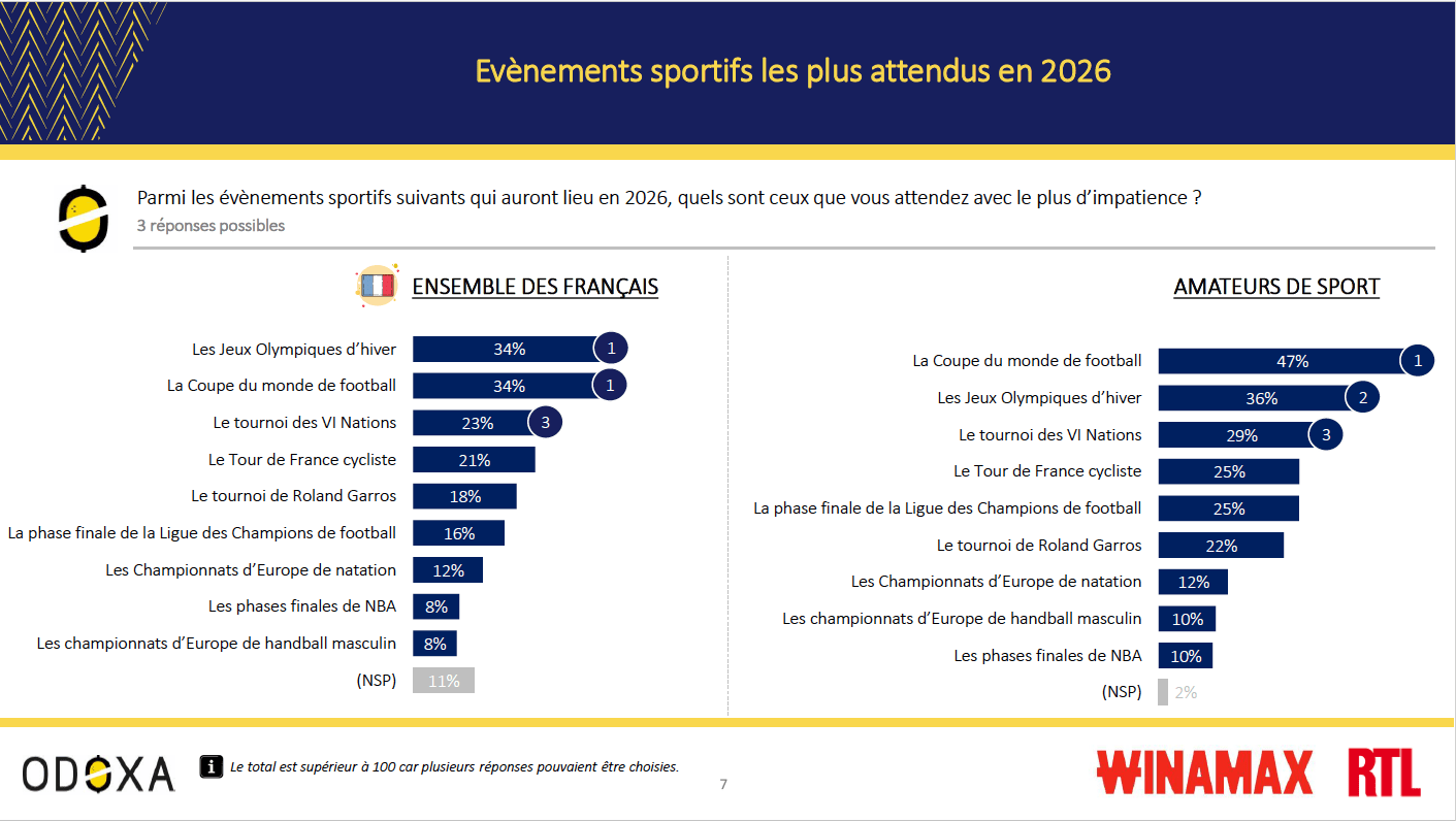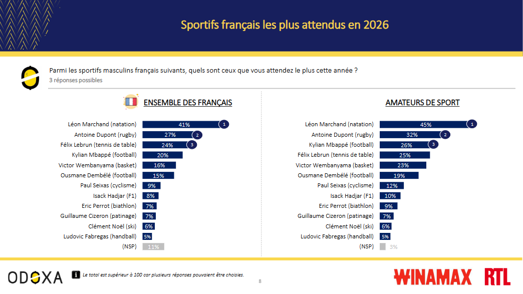 Selon un sondage Odoxa pour Winamax et RTL les JO d’hiver et la Coupe du monde de football, sont les évènements les plus attendus par les Français en 2026 . Ce sondage révèle également que Léon Marchand est de loin le sportif masculin le plus attendu (41%), devant Antoine Dupont (27%) et Félix Lebrun (24%). Chez les femmes, Pauline Ferrand-Prévot (35%) devance Perrine Lafont (25%), Cassandre Beaugrand (21%) et Laurence Fournier Beaudry (21%).