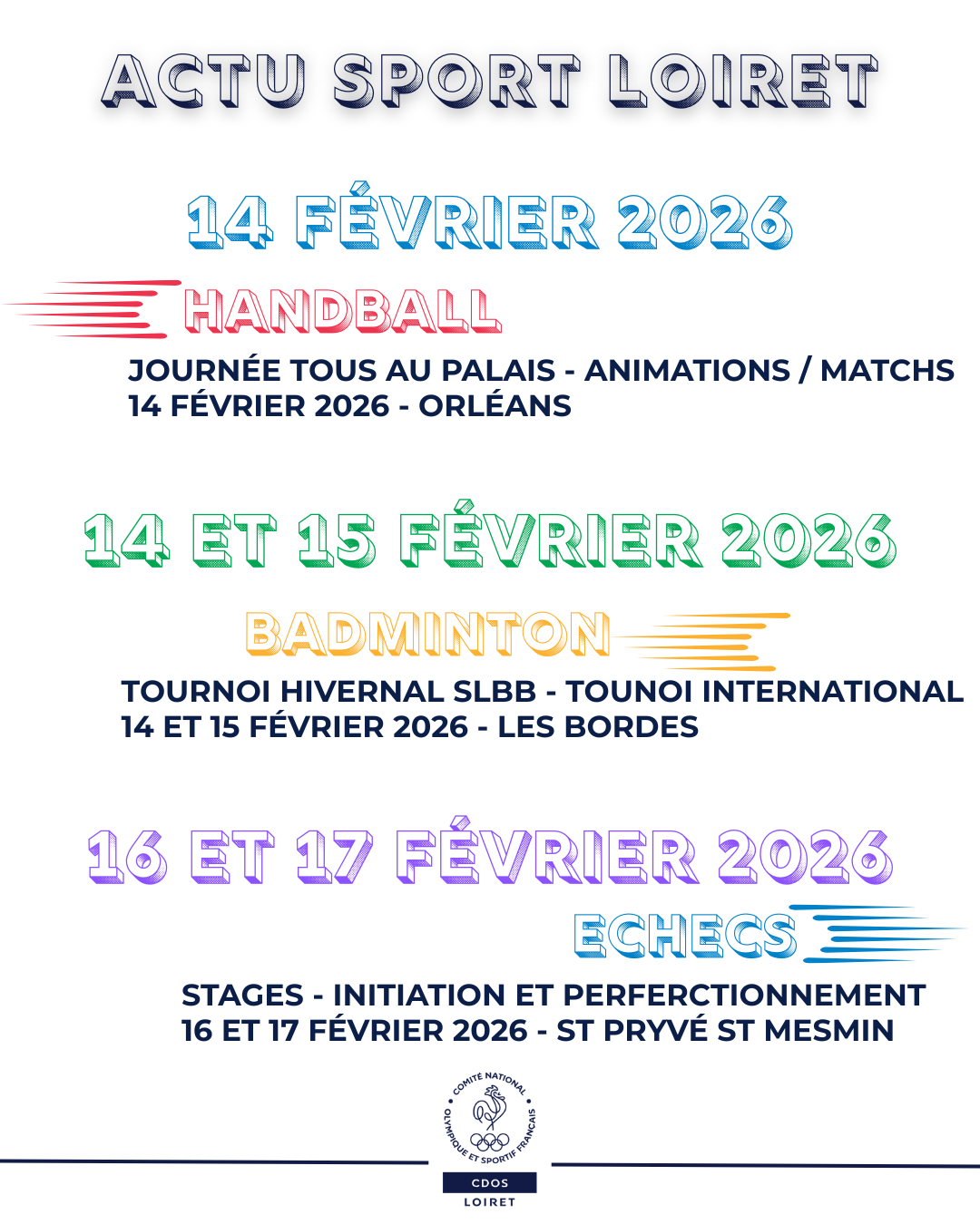 L’US Orléans Handball investit le Palais des Sports d’Orléans pour « Tous au Palais », une journée exceptionnelle autour du handball, le samedi 14 février avec au programme : grands matchs, animations et surprises pour petits et grands ; du Badminton, avec le Tournoi Hivernal SLBB 2026 Les Bordes, un tournoi individuel – International qui se déroulera les 14 et 15 février au Gymnase Elisabeth Torlet des Bordes ; le CDJE45 et le club La Tour, Prends Garde organisent, les 16 et 17 février, deux stages d’échecs à St-Pryvé St-Mesmin, salle Roger Toulouse : initiation & perfectionnement, pour découvrir le jeu d’échecs ou de faire progresser votre stratégie…