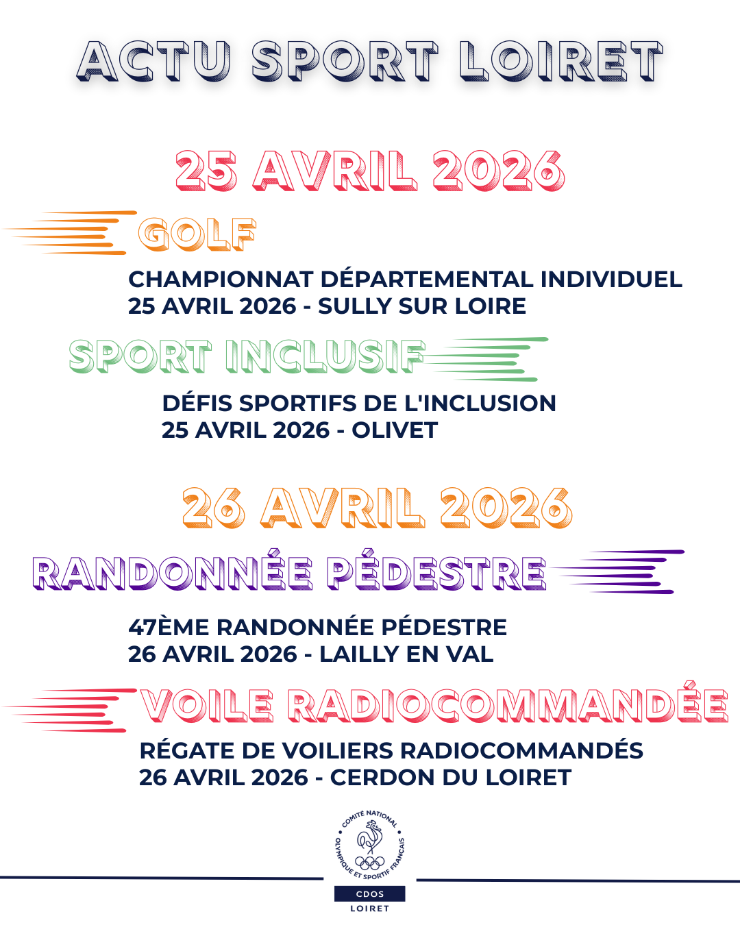 Au programme du weekend,  du golf avec le Championnat départemental individuel, dames et messieurs,  au golf de Sully sur Loire, samedi 25 avril ; du sport inclusif avec les Défis Sportifs de l’Inclusion organisé par le Lions Club Orléans et le Comité Départemental Sport Adapté Loiret, 10 disciplines sportives, un atelier diététique et un atelier autour du mouvement vous seront proposés tout au long de la journée de samedi sur le Domaine du Donjon à Olivet ; de la marche, avec la 47ème randonnée pédestre de Lailly en Val, 4 circuits : 22, 14, 10 et 5 km à travers plaines et bois vous sont proposés dimanche ; de la voile radiocommandée, le cercle de la voile du centre organise, le 26 avril 2026, à l’étang du puits, une régate de voiliers radiocommandés ouverte à la classe M…